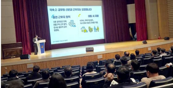 23일 오전 광주 서구 광주시청 3층 대회의실에서 '광주·전남 행정통합 공무원 설명회'가 열리고 있다. 광주시 공무원들은 전남도와 행정통합에 대해 '근무지 이동'과 '인사 불이익…
