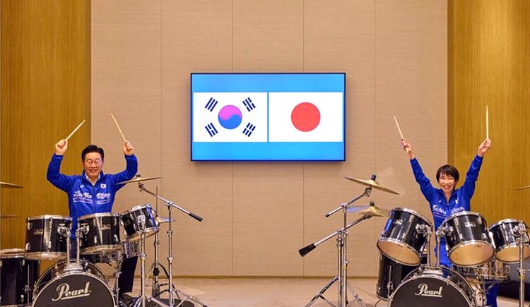 이재명 대통령이 다카이치 사나에 일본 총리와 함께 13일(현지 시간) 일본 나라현 회담장에서 일본 측이 마련한 푸른색 유니폼을 함께 착용하고 일본의 대표적인 악기 브랜드인 '펄' 드럼 앞에 나란히 앉아 즉석 드럼 합주를 선보이고 있다. (공동취재)
