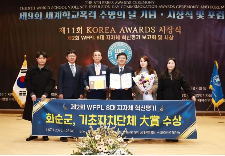 전남 화순군은 28일 서울 국회의원회관에서 열린 ‘제2회 WFPL 8대 지자체 혁신평가’ 시상식에서 대상 수상 지자체로 선정됐다. 이번 평가는 세계청년리더총연맹(WFPL) 부설 지자체 혁신평가위원회가 세계언론협회 등과 공동으로 진행했으며, 화순군은 최고 평점을 기록했다.