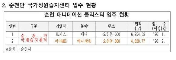 문화체육관광부는 지난해 12월 17일부터 18일까지 이틀간 전남 순천시가 추진 중인 애니메이션 클러스터 조성사업에 대해 특별조사를 실시했다. 해당 사업은 총사업비 390억 원으로 국비 195억 원, 도비 78억 원, 시비 117억 원이 투입됐다. 조사 결과 문체부는 「보조금 관리에 관한 법률」을 위반한 사례를 다수 적발했으며, 상당액의 보조금 환수 조치를 예고한 것으로 알려졌다.