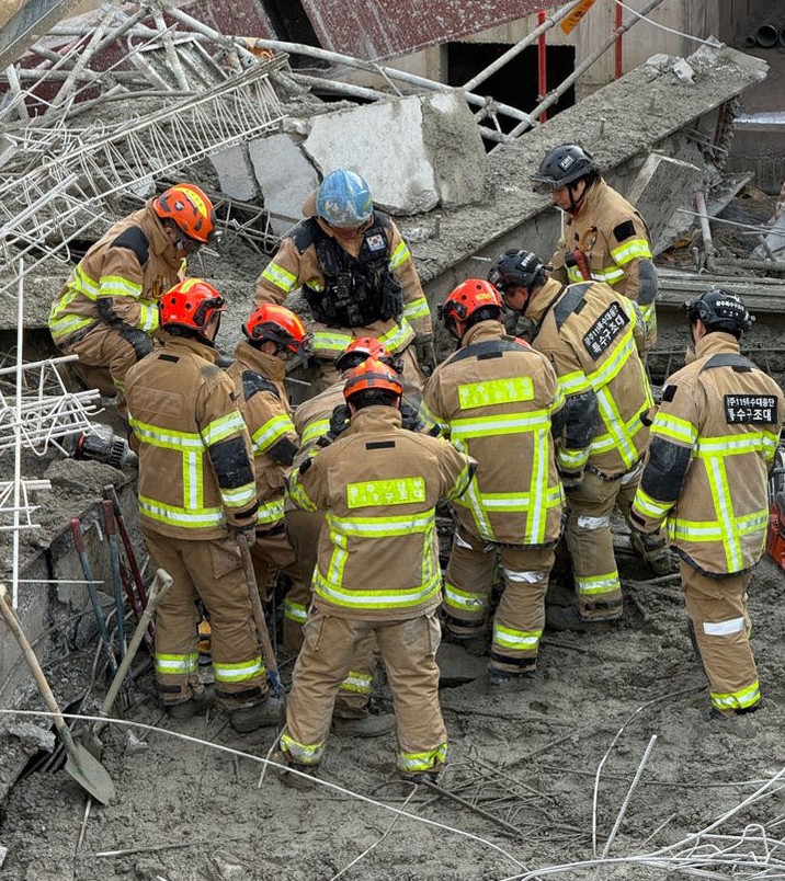 11일 오후 광주 서구 치평동의 광주대표도서관 붕괴 사고 현장에서 출동한 구조대원들이 매몰자 수색·구조 작업을 벌이고 있다. (사진=소방청 제공)