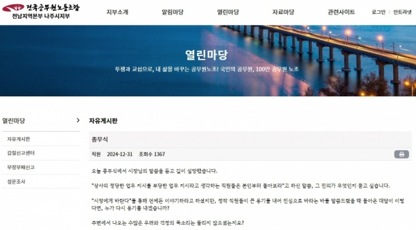 나주시 공무원 노조 자유게시판에 익명의 시청 직원이 작성한 글