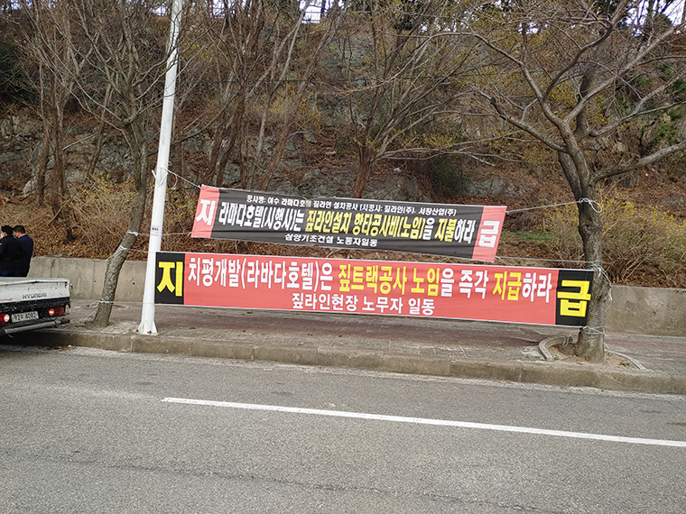 이들은 라마다 호텔 공사장 정문에서 근로자 10여 명이“치평개발(라마다호텔)은 짚트랙공사 노임을 즉각 지급하라” 라고 적힌 현수막을 내걸고 시위하며 "비열하고 정직하지 못한 기업, 내가 힘들게 일한 공사 대금 체불에 항의하며 농성을 벌였다.