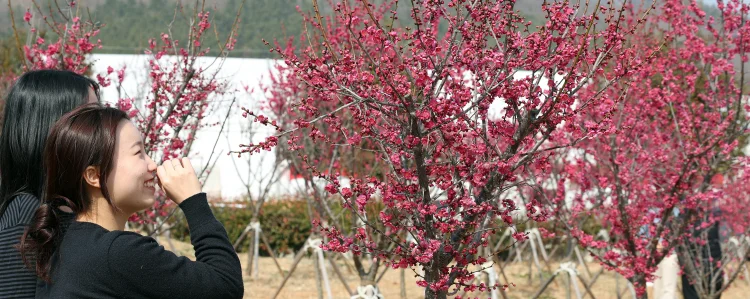 봄의 서막을 알리는 제54회 강진청자축제가 열리고 있는 22일 강진군 대구면 고려청자박물관 일원, 축제장 남문 입구에 조성된 봄의 꽃밭에 활짝 핀 유채꽃과 홍매화가 관광객들의 발길을 사로잡으며 봄이 오고 있음을 알리고 있다.