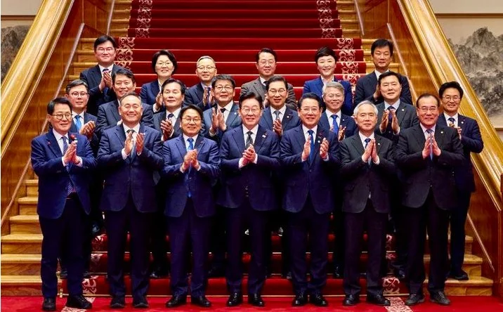 이재명 대통령이 9일 광주·전남 지역구 국회의원들과 강기정 광주시장, 김영록 전남지사를 청와대로 초청해 오찬 간담회를 갖고 기념촬영을 하고 있다. (사진=광주시·전남도 공동 제공)