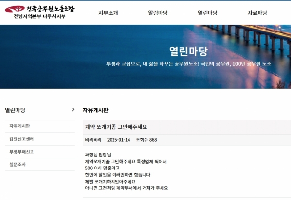 나주시공무원노조 게시판 계약 쪼개기 익명 게시글 올라와...