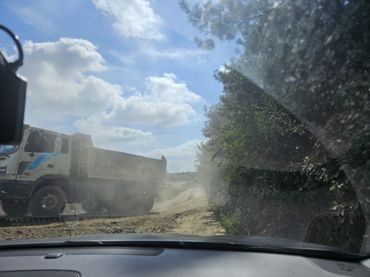「대기환경보전법」 제43조 1항은 사업자가 비산먼지 발생을 억제하기 위해 필요한 시설을 설치하거나 필요한 조치를 하도록 규정하고 있으며, 제48조 1항 역시 비산먼지 발생 억제시설 설치를 의무화하고 있다. 그럼에도 불구하고 해남군이 발주한 이번 사업 현장에서는 이러한 법적 기준이 무시된 채 덤프트럭이 흙먼지를 뒤집어쓰며 오가고 있었고, 현장 인근은 시야를 가릴 정도의 비산먼지로 뒤덮여 있었다. 주변 나무는 먼지로 인해 잎이 누렇게 변색돼 고사 위기에 놓여 있었다.
